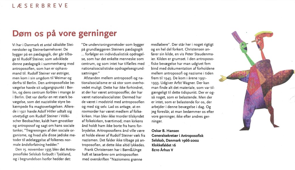 Som svar på et af mine indlæg om antroposofi, racisme og nazisme i Børn og Unge (2003) skrev Oskar Borgman Hansen: